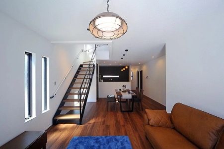 床や天井に無垢材を使い、階段の手すりやキッチンの棚受けにアイアンの黒いラインを添えると、